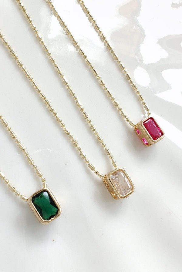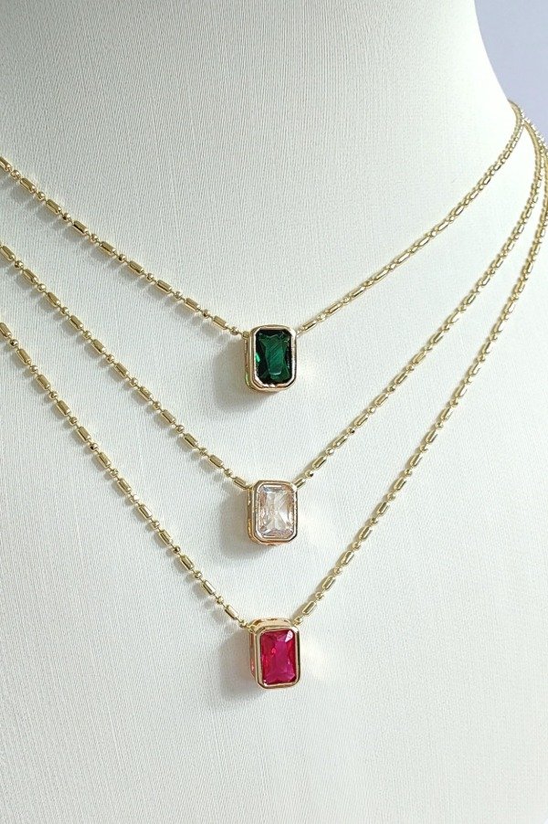 Collar Miel de oro Laminado 18k con dije rectangular pasante con cúbics blanco, verde y fucsia con cadena fina tramada de 45cm.