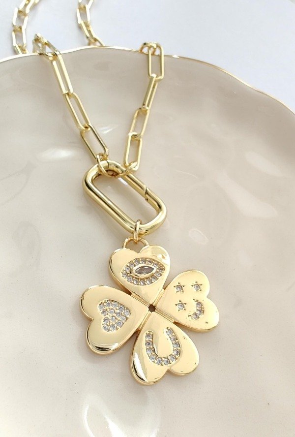 Collar Trébol laminado en oro 18k con circones y cadena de eslabónes alargados con cierre broche rectangular.
